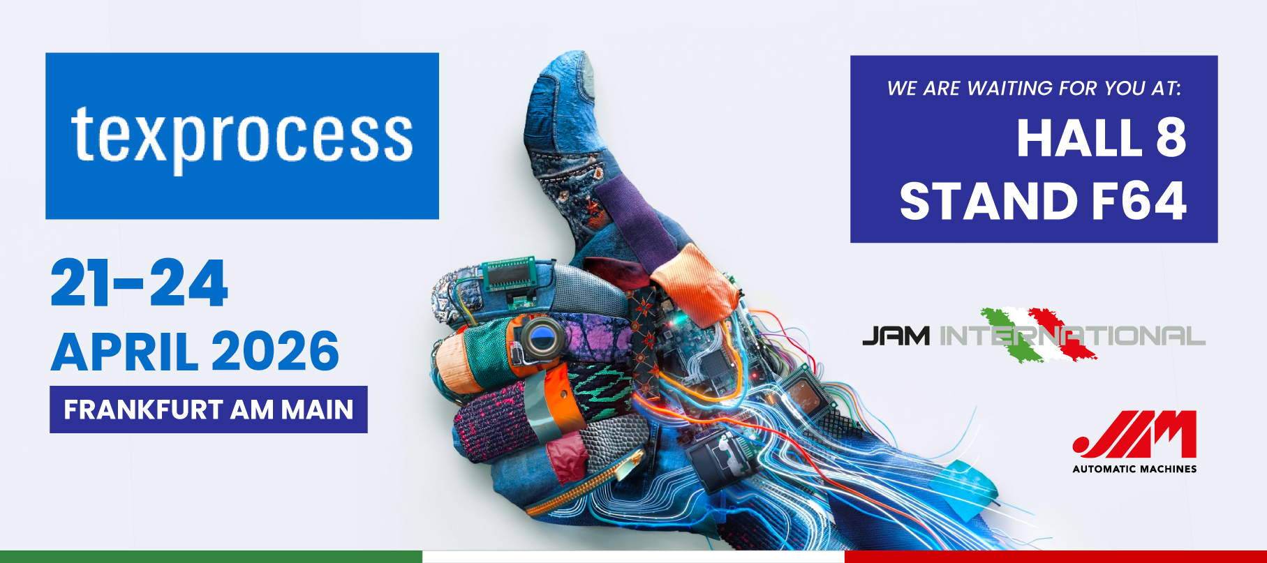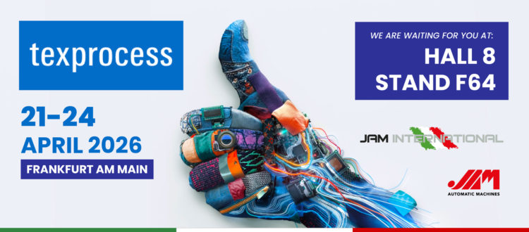 JAM International se complace en anunciar su participación en Texprocess 2026, la principal feria internacional dedicada a las tecnologías de procesamiento para textiles y materiales flexibles, que se celebrará en Fráncfort del 21 al 24 de abril de 2026.