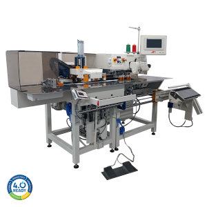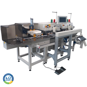 Macchina automatica per applicazione tasche con testa cucitrice in asse elettrico e gruppo piegatore/