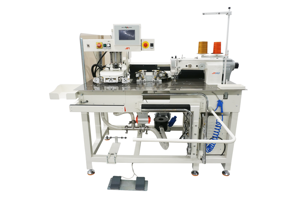 Macchina automatica per applicazione tasche con gruppo piegatoreL’unità automatica JT852M è una macchina ad area programmabile per l’applicazione di tasche a toppa su jeans e simili, con nuovo gruppo di piegatura da 65×65 mm a 240×240 mm e scaricatore automatico.